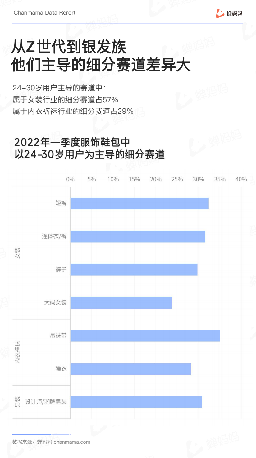 24-30岁用户主导的赛道中:属于女装行业的细分赛道占57%,属于内衣裤袜行业的细分赛道占29%。