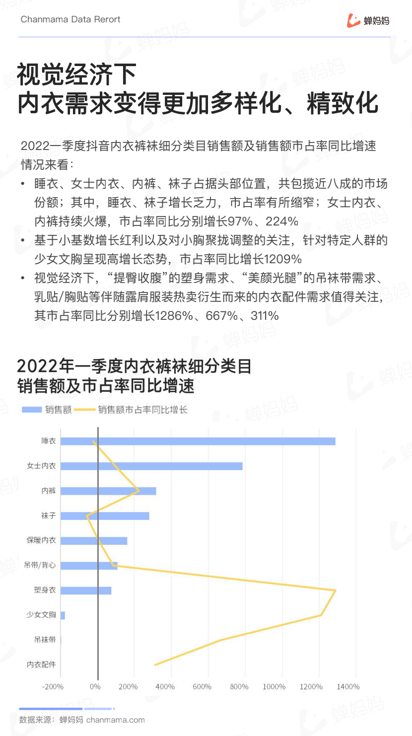 视觉经济下,“提臀收腹”的塑身需求、“美颜光腿”的吊袜带需求、乳贴/胸贴等伴随露肩服装热卖衍生而来的内衣配件需求值得关注,其市占率同比分别增长1286%、667%、311%。