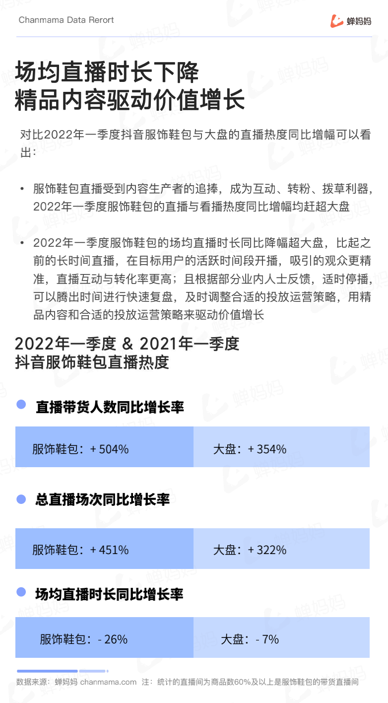 2022年一季度服饰鞋包的场均直播时长同比降幅超大盘,比起之前的长时间直播,在目标用户的活跃时间段开播,吸引的观众更精准,直播互动与转化率更高;且根据部分业内人士反馈,适时停播,可以腾出时间进行快速复盘,及时调整合适的投放运营策略,用精品内容和合适的投放运营策略来驱动价值增长。