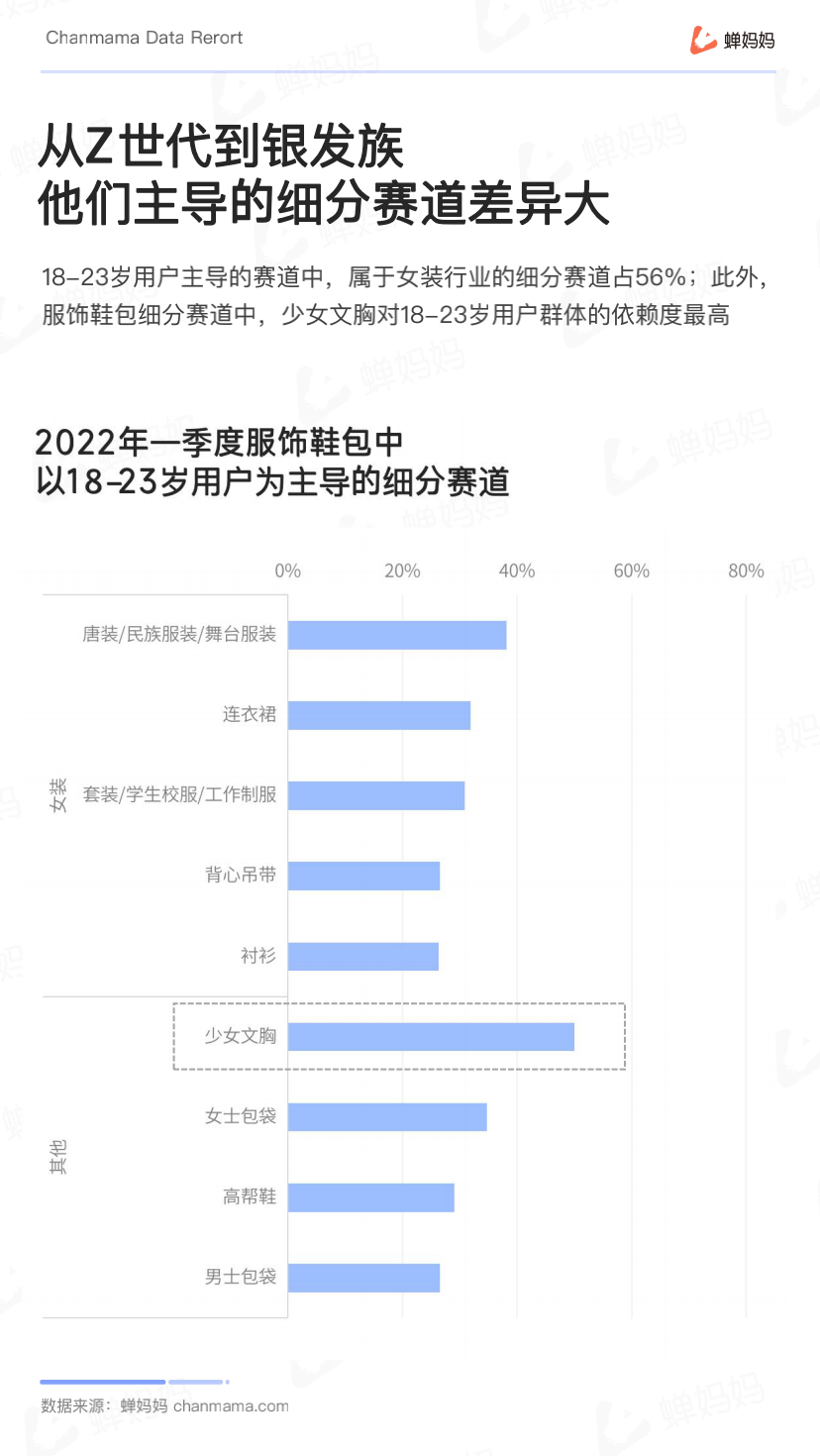 18-23岁用户主导的赛道中,属于女装行业的细分赛道占56%;此外,服饰鞋包细分赛道中,少女文胸对18-23岁用户群体的依赖度最高。