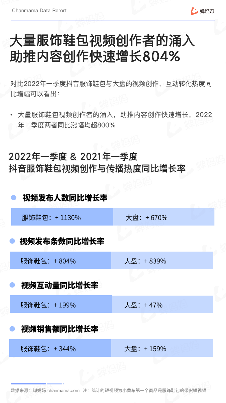 大量服饰鞋包视频创作者的涌入,助推内容创作快速增长,2022年一季度两者同比涨幅均超800%。
