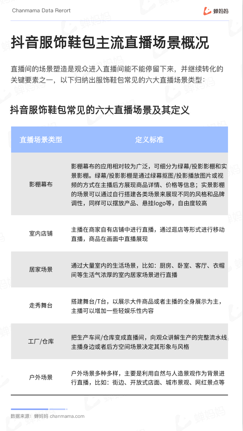 直播间的场景塑造是观众进入直播间能不能停留下来,并继续转化的关键要素之一,以下归纳出服饰鞋包常见的六大直播场景类型。