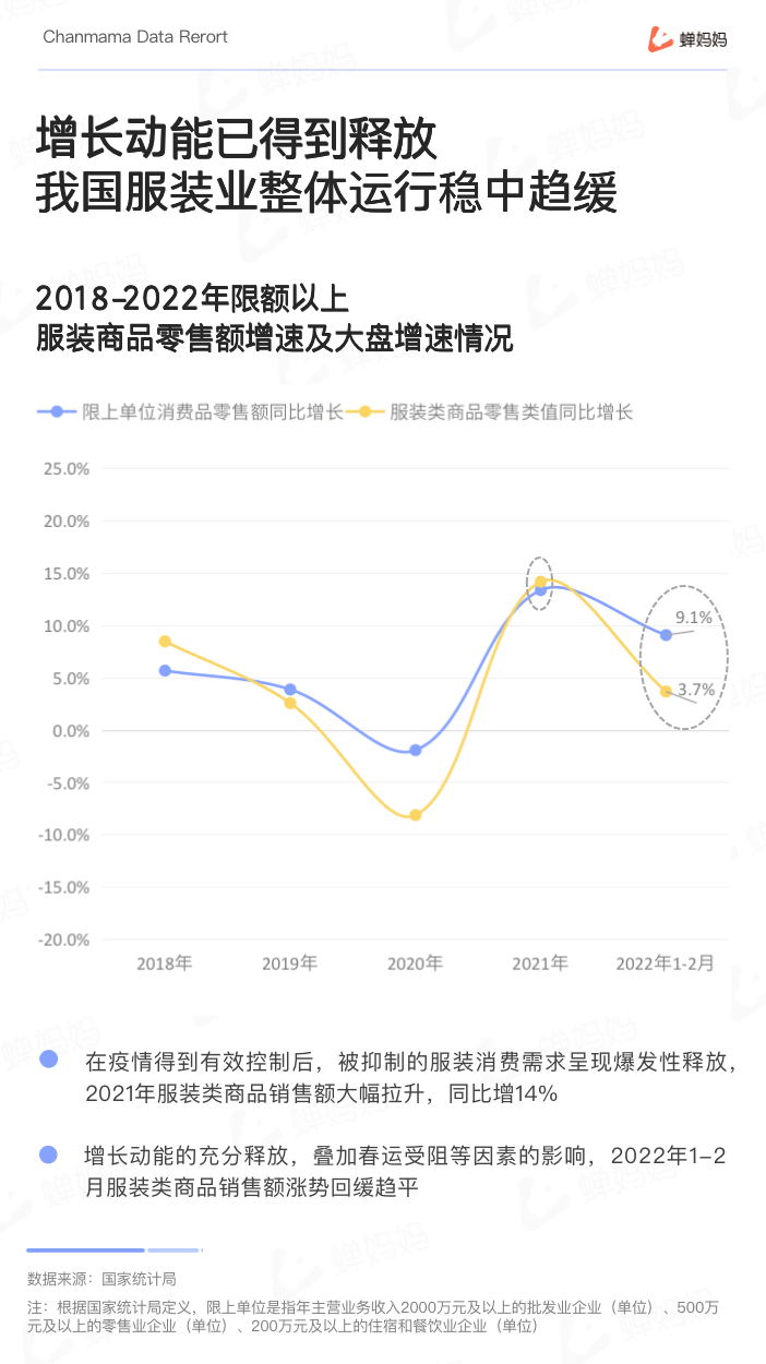 增长动能的充分释放,叠加春运受阻等因素的影响,2022年1-2月服装类商品销售额涨势回缓趋平。