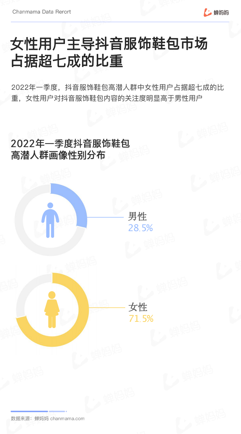 2022年一季度,抖音服饰鞋包高潜人群中女性用户占据超七成的比重,女性用户对抖音服饰鞋包内容的关注度明显高于男性用户。