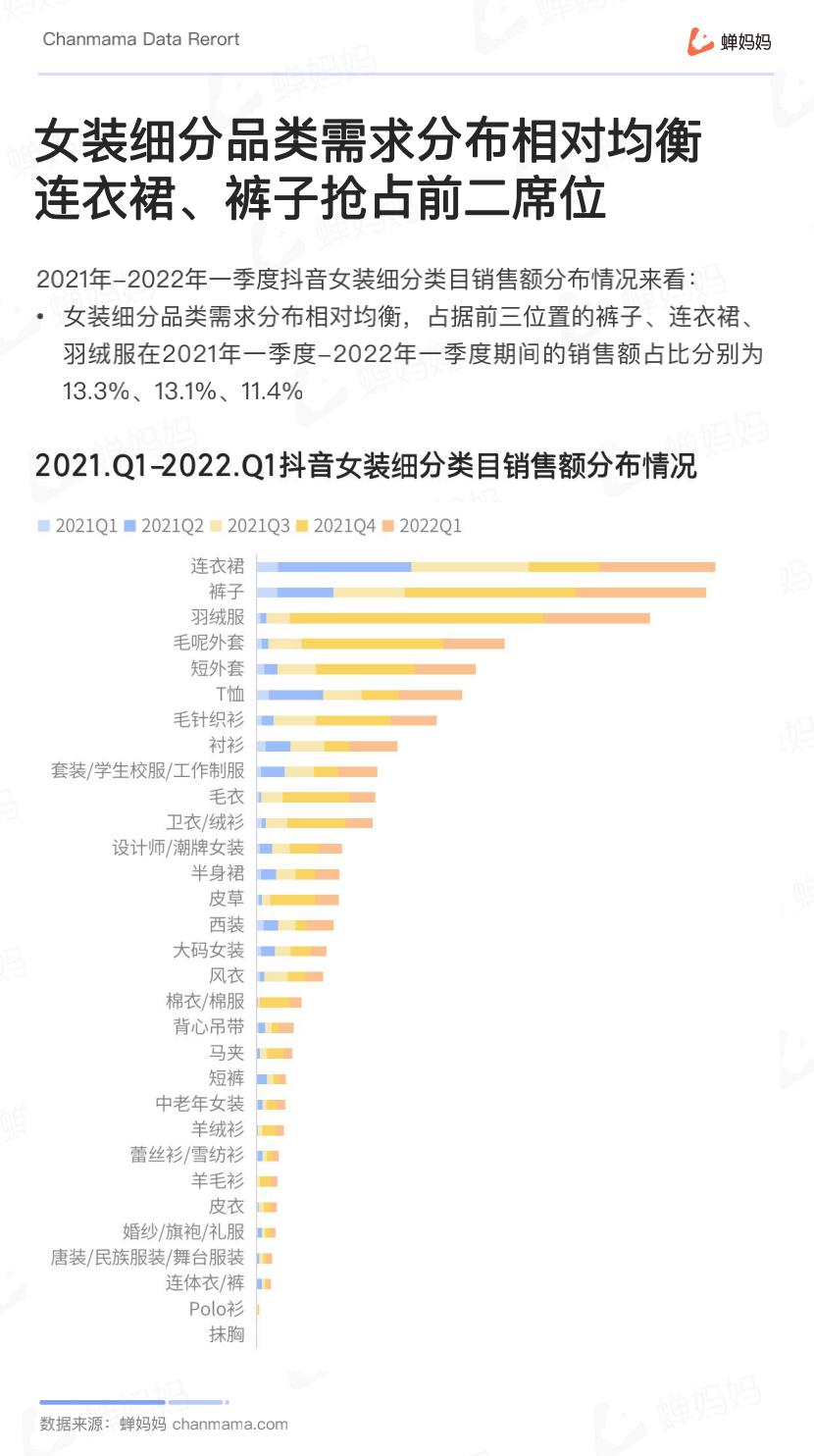 2021年-2022年一季度抖音女装细分类目销售额分布情况来看: