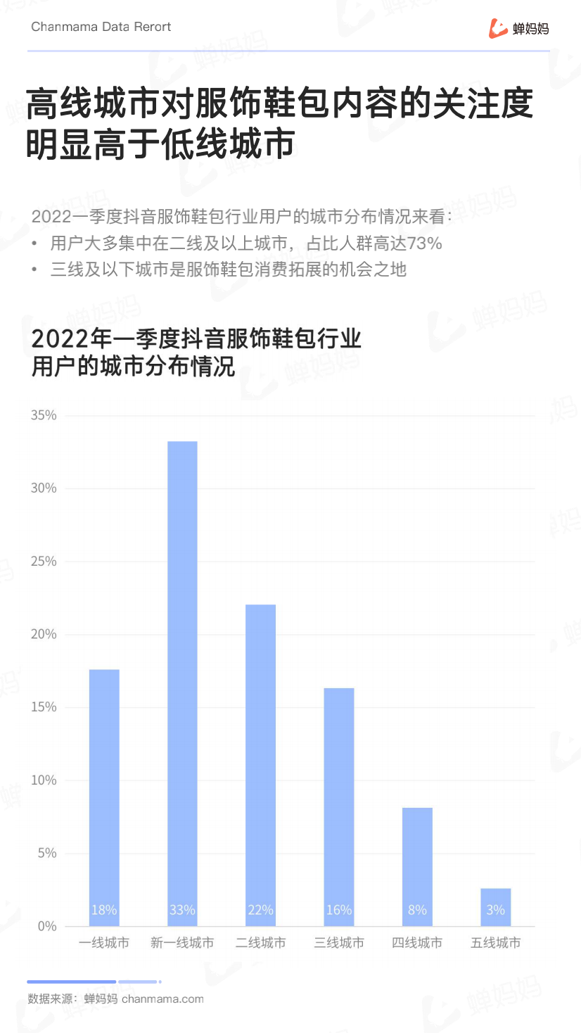 2022一季度抖音服饰鞋包行业用户的城市分布情况来看:用户大多集中在二线及以上城市,占比人群高达73%;三线及以下城市是服饰鞋包消费拓展的机会之地。