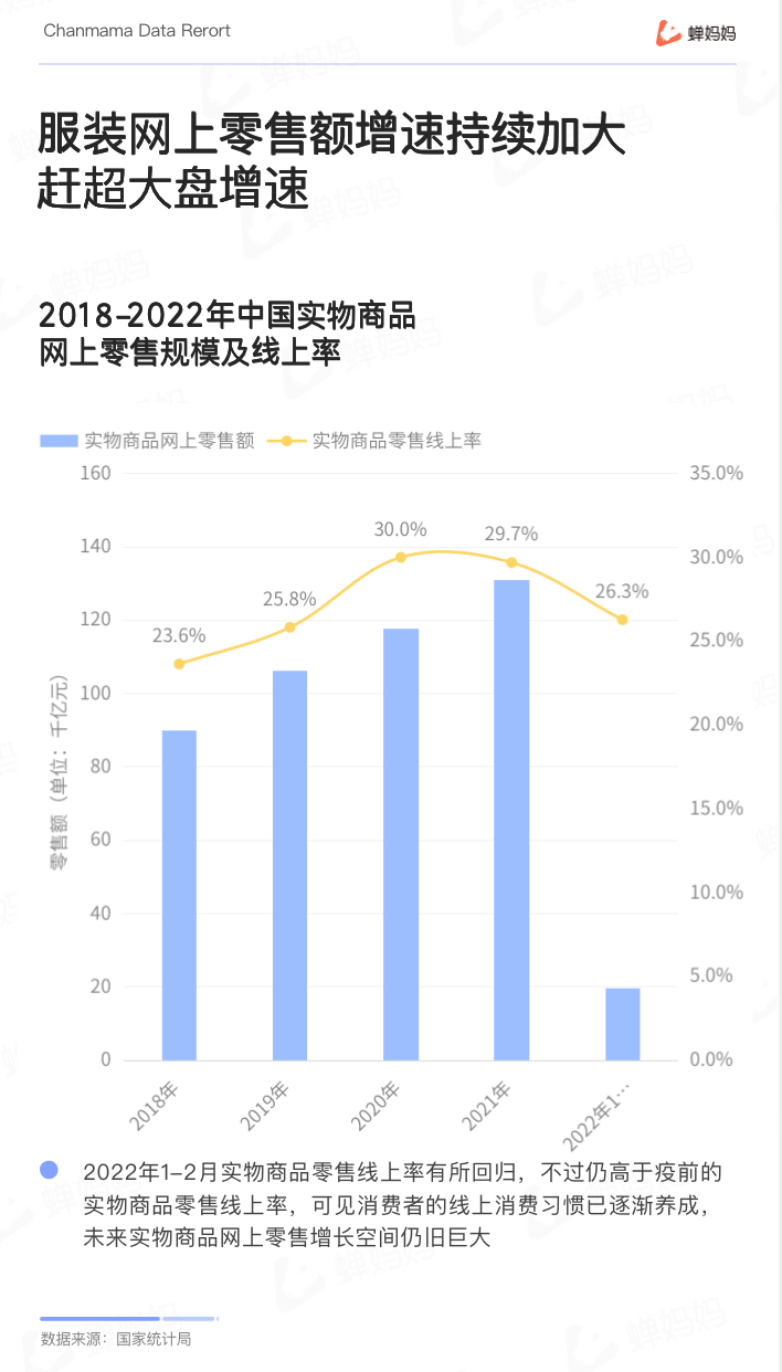 疫情影响下,2021年服装销售额迎来报复性增长。进入2022年后我国服装业整体运行稳中趋缓;不过消费者线上消费习惯已渐养成,服装网上零售额增速呈持续加大态势,未来增长空间依旧巨大。