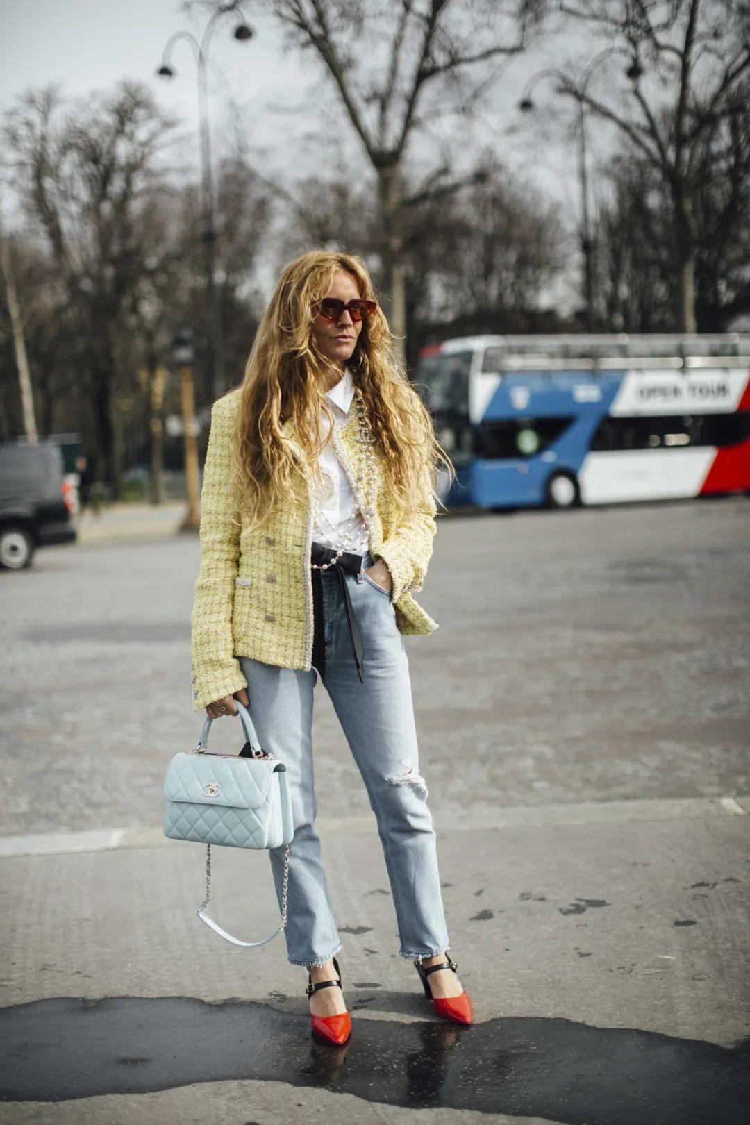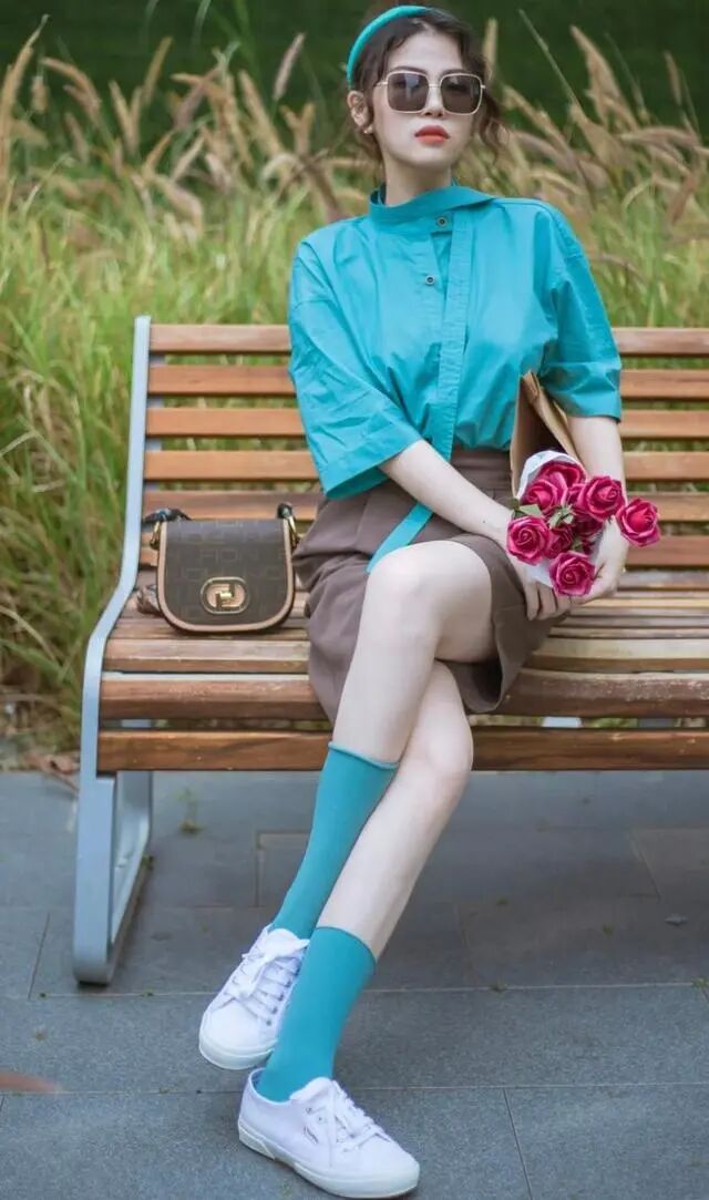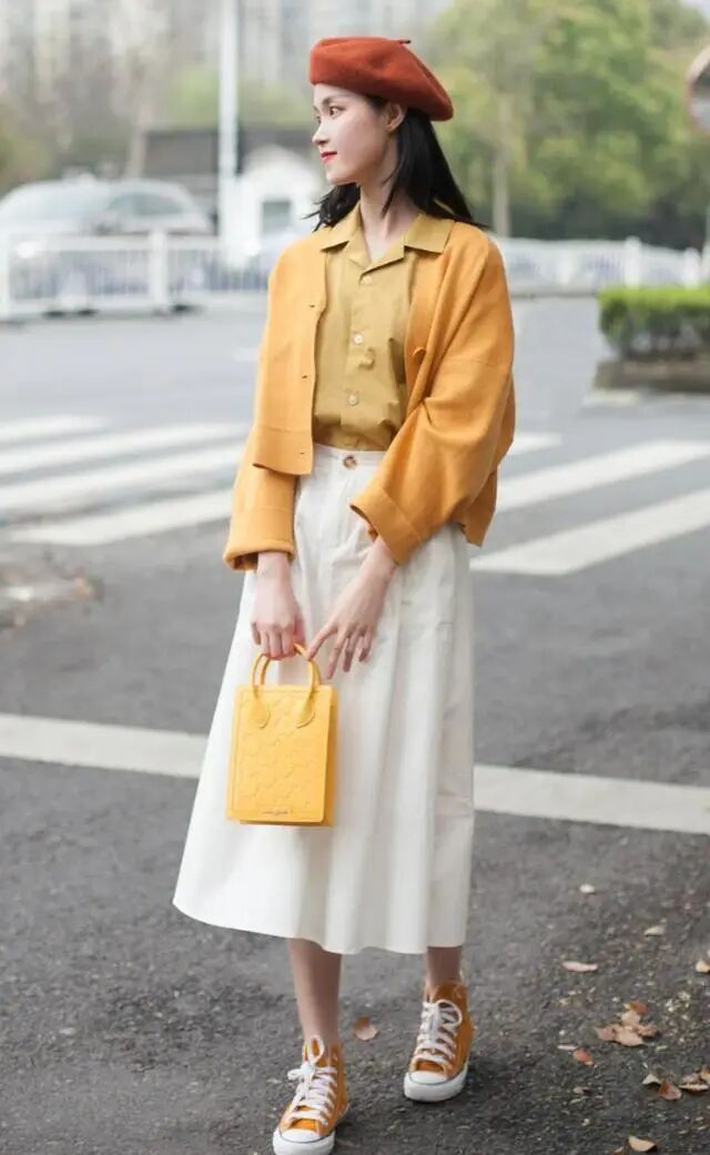 如果害怕亮色太多,可以局部来点亮色,比如黄色袜子、橘色包包、红色鞋子……