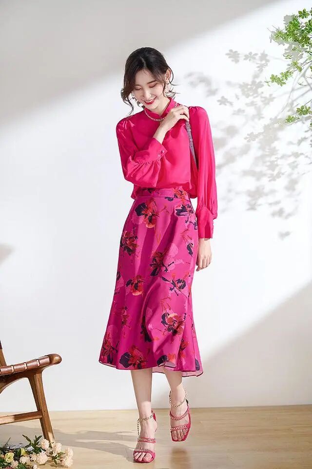 玫红色是亮色中相对温柔的色彩,好搭配,相近色也多,是女人最常用的表达心情和爱意的色彩,也是最能直击女人心灵的“解语之色”。