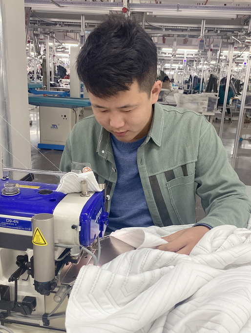 99年出生的马精良,今年22岁了,来自江苏省,淮滨的纺织服装产业在他的家乡小有名气,当地很多年轻人在淮滨从事纺织服装产业。几个月前,他和家里的亲戚一起来淮滨找工作,“这两年受疫情影响,家里的生活状况也发生了很大变化,为了减轻家里的负担,我跟随亲戚一同来到淮滨,淮滨的气候条件与我老家很像,我很快便适应了。听别人说晨瑞在招工,就来试了下,开始的时候心里不太有底,之前从来没接触过服装行业,但是在师傅的带领下,我很快便上手了,流水线工作,操作简单,吃住都在厂区,环境优美,值得长期发展。”马精良说道。