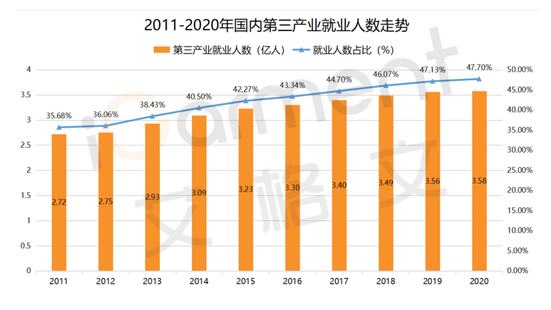 2011-2019年,我国第三产业就业人数持续增长,2020受疫情影响虽有所下降,但2011-2020年第三产业就业人数的CAGR为2.8%,占就业人口总数的比例从35.7%提升至47.7%。其就业人口的增长将推动职业装的发展。