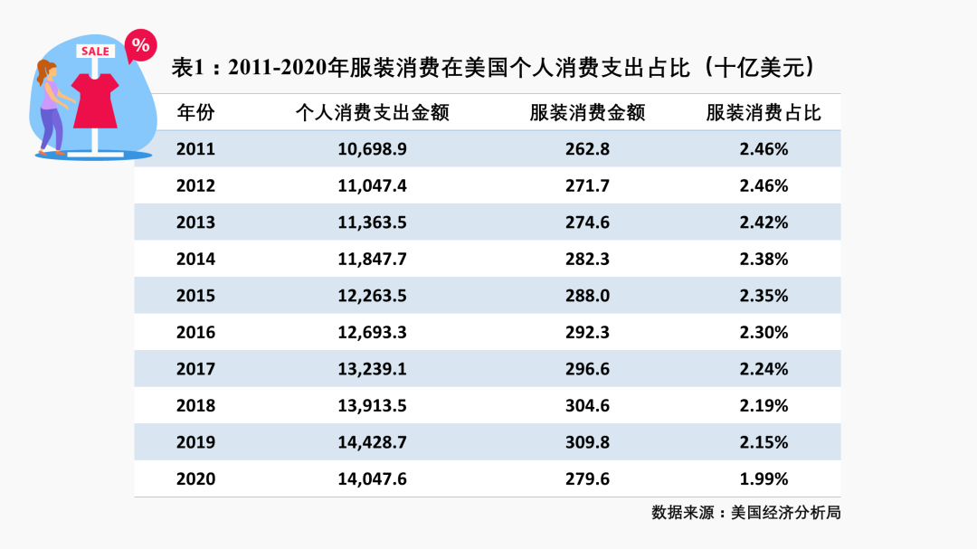 疫情前,服装作为非必需品在美国个人消费支出的占比常年保持在2-2.5%之间。疫情发生后,消费者对服装服饰类产品消费更加谨慎,服装消费市场恢复发展也经历了较长的时间周期。从美国经济分析局公布的数据看,2020年美国个人消费支出中服装类产品占比降至1.99%,近十年来首次跌破2%。