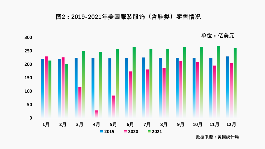 进入2021年,在疫情防控松绑,财政补贴刺激、消费信心反弹等多重影响下,美国零售总额逐月上升并稳定在较高水平。消费者对服装类产品的“报复性”消费也开始初显端倪。1.9万亿美元经济刺激法案生效的当月(2021年3月),美国服装类产品销售额恢复到250亿美元,同比增长115.4%,与疫情前的2019年同期相比增长12%。4月该类产品同比猛增764.6%,较疫情前同期也有10.8%的增长。此后,美国服装服饰(含鞋类)产品的零售销售额一路高奏凯歌,高位增长一直维持到年底。2021年全年美国上述产品销售超过3031亿美元,同比增长48.8%,较2019年增长12.9%,纺织品服装消费基本步入正常发展轨道。