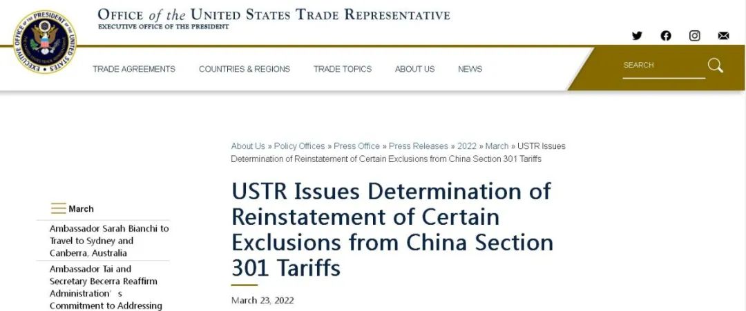 ”当地时间3月23日,美国贸易代表办公室发表声明,宣布重新豁免对352项从中国进...