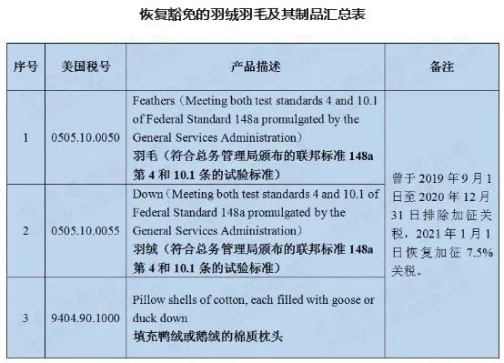 此外,此次关税豁免还包括0505.10.0050羽毛、0505.10.0055羽绒和9404.90.1000填充鸭绒或鹅绒的棉质枕头3项产品。