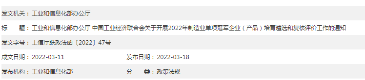 2022年制造业单项冠军企业(产品)培育遴选和复核评价工作正式启动