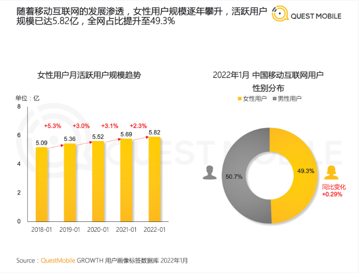 日前,移动互联网商业智能服务商QuestMobile发布《2022年“她经济”洞察报告》,报告显示,随着互联网的发展,女性用户的规模正在逐年攀升,活跃用户规模已达全网5.82亿,全网占比提升至49.3%。