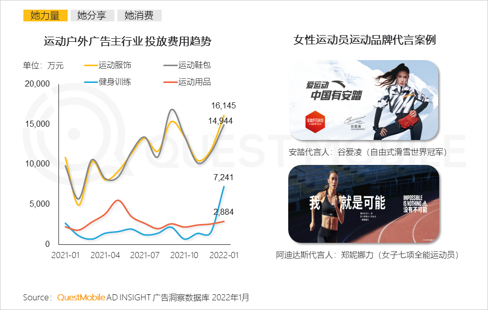 女性线上用户规模在近几年的增长,主要来自于下沉市场用户和银发人群。而随之增长的,还有使用App的时长和数量,QuestMobile数据显示,2022年1月,女性用户月人均使用时长突破170小时,App使用个数达25.6个,分别提升3.1%、2.6%。在女性用户互联网使用程度加深的情况下,女性消费能力和消费意愿也越来越强,数据显示,线上消费中,女性用户的消费意愿分布主要处于中部水平,但在近两年,中高消费意愿已经提升2.6%;同时,女性消费能力也做到1000元以上,近两年同比增长1.2%。此外,北京冬奥会期间,以谷爱凌为代表的女性运动员精彩表现,外加以王濛为代表的冬奥项目专业解说,推高全民观看冬奥热情,品牌也大幅提高广告投放,女性运动员受品牌热捧。在内容传播方面,女性的声音也在持续放大。在各大内容平台、电商直播间,与女性相关的美妆、穿搭、种草等成为热门板块。这意味着,女性用户通过内容的分享,不断提升自我价值。总体上看,价值追求与品质追求逐渐成为新时代女性消费的主旋律,在边界与日扩张的“她经济”生态圈中,“果敢、美貌、运动、悦己”等已然成为女性消费的关键词。