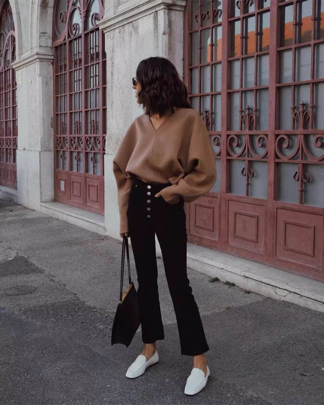 由于黑色是属于低明度的颜色,所以一般选择深一点的大地色来与黑色单品配对,风格气质会更契合,搭配效果往往会更好。