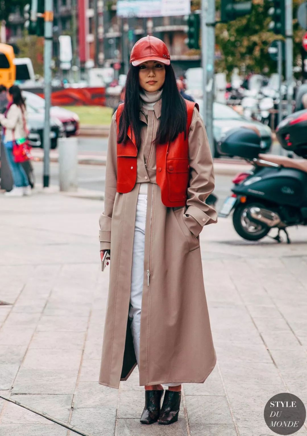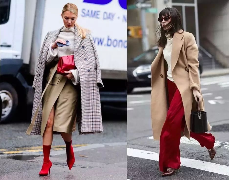 如果你觉得前面的搭配都太低调,不妨试试高阶打开方式,与饱和度极高的红色组合,热情的红色与内敛的大地色搭配,互补不足,而且很新鲜。加上白色为过渡色,不止是显白,还自带复古风滤镜,简直美翻了。