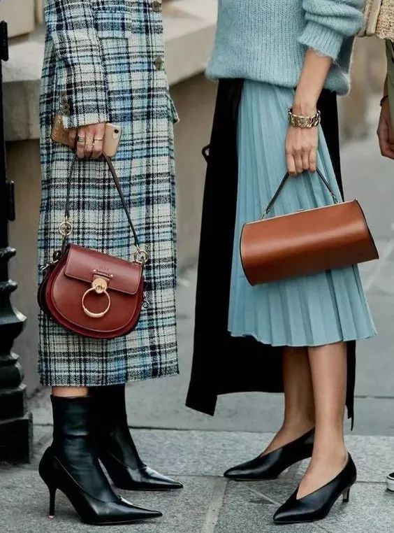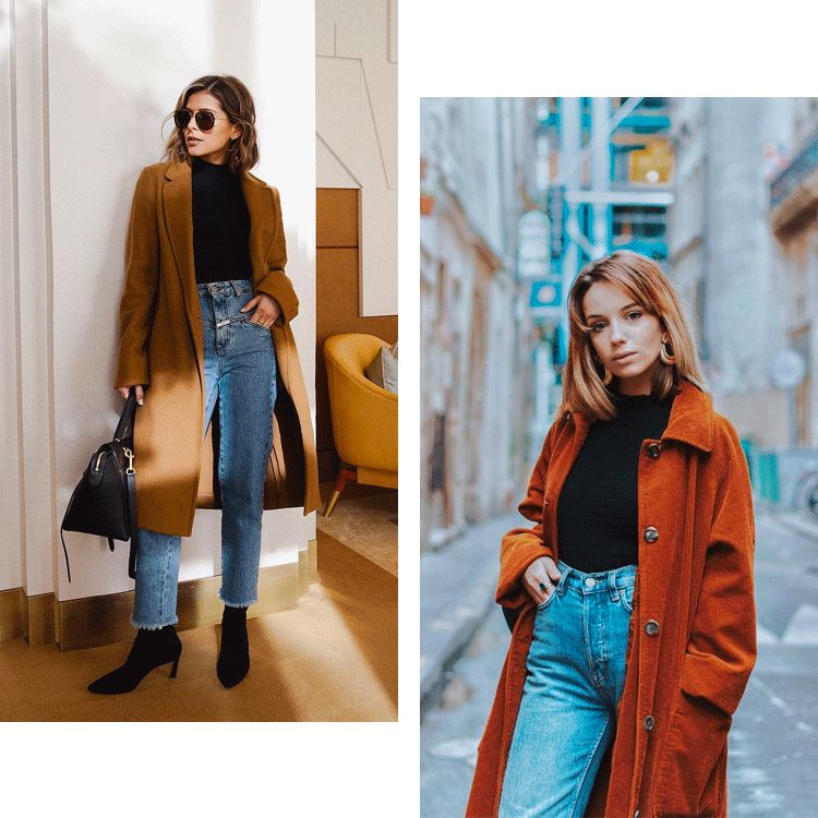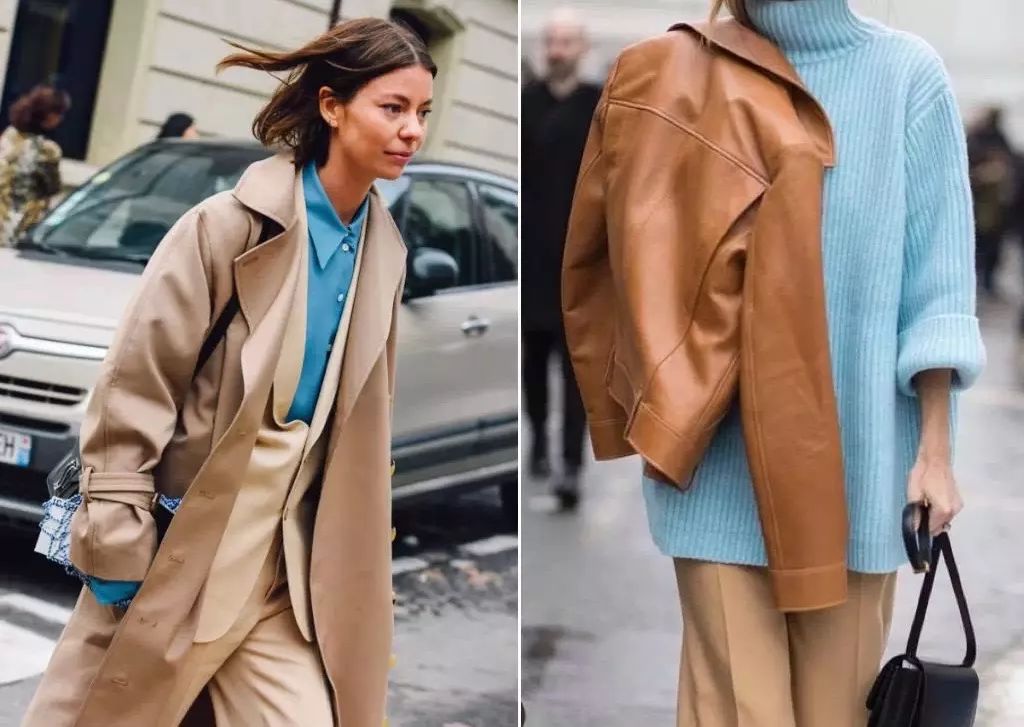 蓝色毛衣+棕色外套,棕色上衣+牛仔裤,尝试一个棕色的包,都是很好学的蓝棕配色入门!