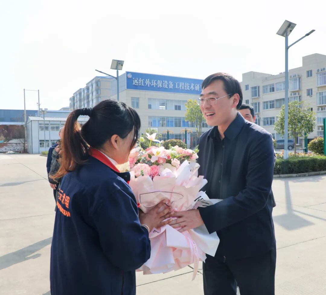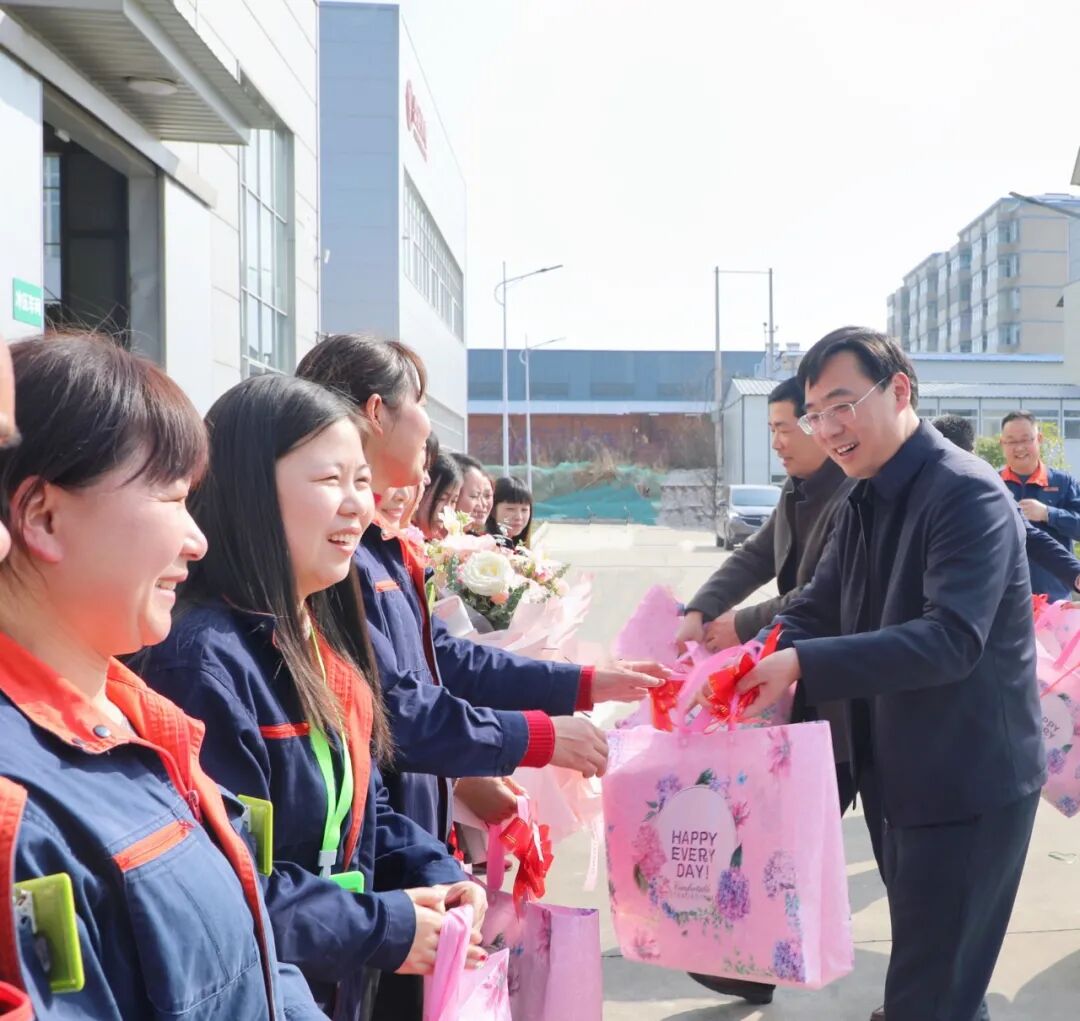 情暖三八节,关爱女职工。在第112个“三八”国际妇女节即将来临之际,3月3日下午,光山县县长李伟,县委常委、办公室主任杨坤,县人大常委会副主任、县总工会主席陈猛,县政协副主席舒世远,官渡河产业集聚区管委会主任汪年旺带着对光山县妇女同胞们的关心关爱,来到白鲨针布、利佳服饰、三元光电等重点企业,向坚守在企业一线的女职工们送上精心准备的鲜花、礼物和节日祝福。
