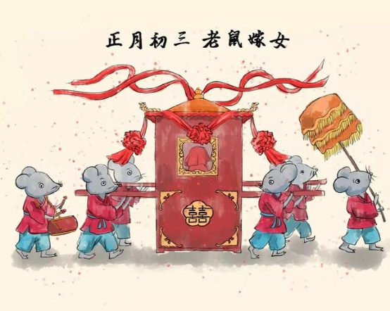 初三晚上是“老鼠娶亲”的日子,所以一般人家都早早熄灯睡觉,以免骚乱了鼠辈,并在屋角洒落一些米粒、糕饼,供老鼠食用,称为“老鼠分钱”,表示和老鼠共享一年的丰收。至于“老鼠娶亲”故事的来源,可能是因为从过年到初一、初二也忙了一阵了,若不早些休息,恐会体力不继,无法办完其它的事;至于过年谣中说:初一早,初二早,初三睡甲饱,就是说初三不但是赤狗日,而且一连几天的忙碌,到了初三,总算告一段落,可以晚起些,补补前两天的睡眠,长保健康。早睡迟起