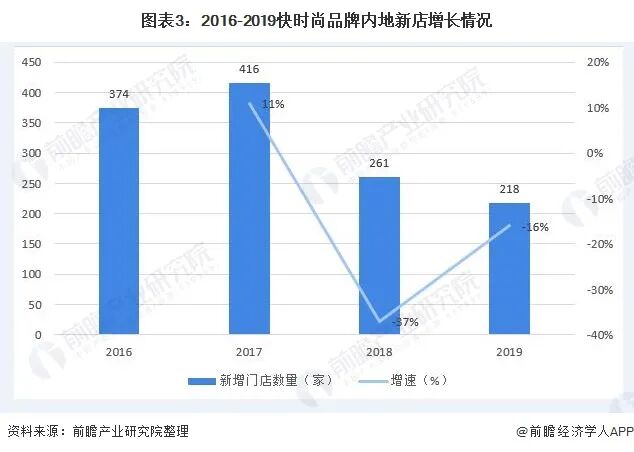 从门店数量上看,近两年我国快时尚新增门店数量呈下降趋势。据不完全统计,2019年,包括H&M、ZARA、优衣库、MJstyle、无印良品、UR、C&A、GAP在内的8个快时尚品牌,在内地共新增218家门店(不含升级重装门店),创历史新低。