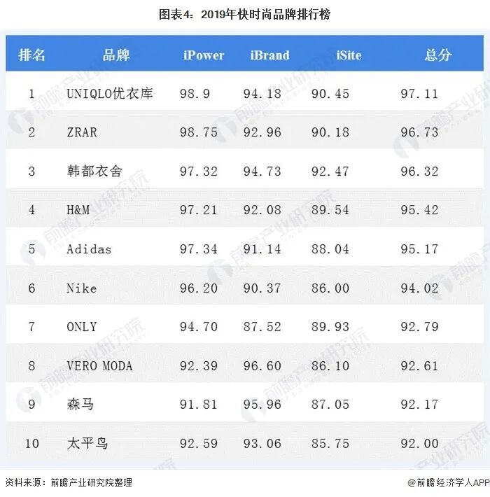 2019年4月,《互联网周刊》和eNet研究院联合发布2019快时尚品牌排行榜。该榜单统计了150个快消品时尚品牌,其中优衣库、ZARA和韩都衣舍位列前三,在前十的排名里,后七位分别是H&M、Adidas、Nike、ONLY、VERO MODA、森马和太平鸟。