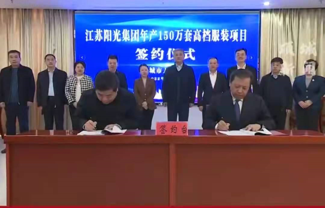 2022年1月24日,项城市人民政府和江苏阳光集团年产150万套高档服装项目正式签约,项目落地后,两年半将达到年产150万套高档服装规模,五年内年销售收入达到15亿元,能够带动3000余人就业,年纳税可超亿元。该企业将成为项城乃至河南纺织服装行业的领军企业,为河南纺织服装产业注入新的发展动能。