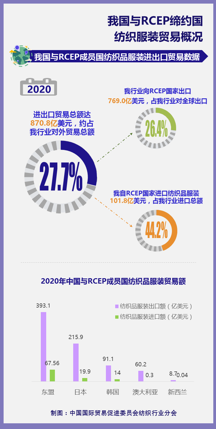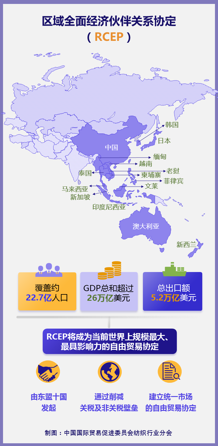 徐迎新表示,从贸易层面看,RCEP有利于纺织业降低出口成本,扩大出口利益。特别是日本作为我行业第四大出口市场,此次通过签署RCEP,我国与日本建立了新的自贸伙伴关系,这是我国首次与世界前十的经济体签署自贸协定,也是我国实施自由贸易区战略取得的重大历史性突破。