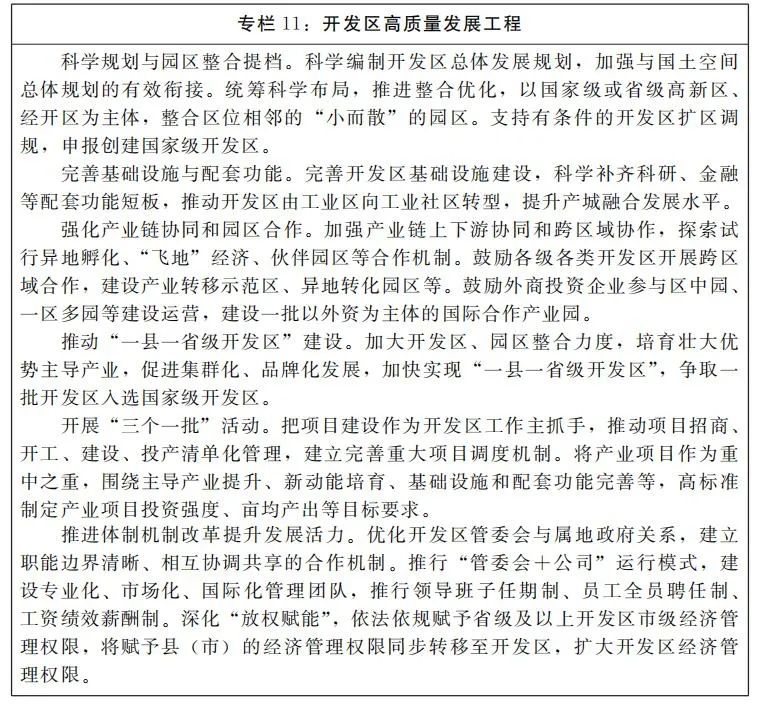 ——载体平台能级实现新提升。每年新增15个左右省级经开区和高新区,到2025年,实现“一县一省级开发区”,3个以上开发区排名全国前20位,营业收入超千亿、超500亿的开发区数量分别达到10个和30个。打造15个左右自贸试验区开放创新联动区、30个省级承接产业转移示范园区。