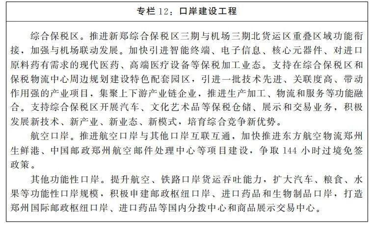 (三)加快口岸和海关特殊监管区建设。加快推进洛阳、开封综合保税区建设,支持条件成熟的地方申建综合保税区。积极申建新的功能性口岸,支持条件成熟的地方申建保税物流中心等海关监管场所。建设种类丰富、功能齐全、运营高效的口岸体系,形成口岸、保税、通关、多式联运、物流、金融等体系联动发展的格局。鼓励综合保税区结合当地产业资源优势,围绕建设加工制造中心、研发设计中心、物流分拨中心、检测维修中心、销售服务中心等目标,培育形成1—2个主导产业。聚焦先进制造业、智能终端、现代医药、新能源、新材料等重点领域,引进一批外向型产业项目,夯实综合保税区产业支撑。深化与沿海沿边地区的口岸、海关特殊监管区域(场所)对接协作,鼓励发展“飞地”经济和异地共建园区。