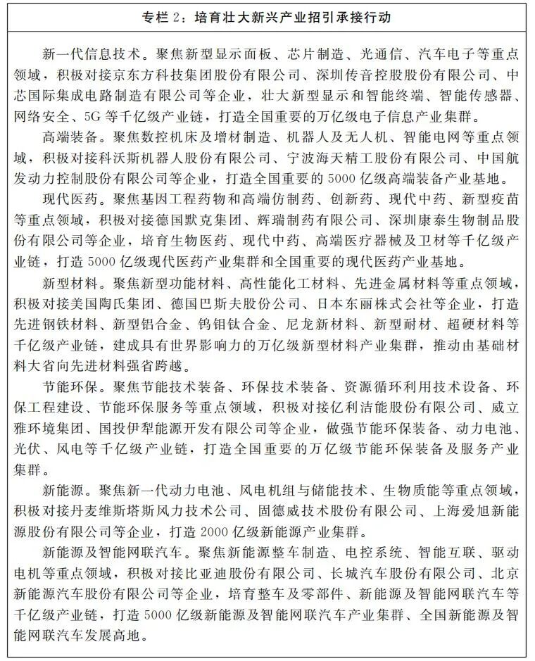 (二)培育壮大新兴产业。抢抓国家培育和发展战略性新兴产业的机遇,充分发挥我省市场优势,突出市场牵引作用,通过引进一批企业和项目带动战略性新兴产业技术突破和规模化发展。围绕新一代信息技术、高端装备、现代医药、新型材料、节能环保、新能源、新能源及智能网联汽车等产业,坚持优中培新、有中育新、无中生有,加快引进一批行业龙头企业区域运营总部、研发总部和生产基地,落地一批引领型、标志性重大项目。