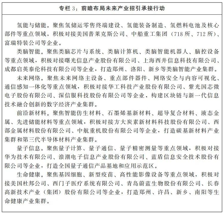 (三)前瞻布局未来产业。把握全球技术变革和产业发展趋势,坚持“现有产业未来化”和“未来技术产业化”,围绕氢能与储能、类脑智能、未来网络、前沿新材料、量子信息、生命健康等未来产业,加快引进培育一批行业龙头企业和新型研发机构,推动一批未来产业项目落地。在氢能与储能、量子信息领域,探索前沿技术多路径融合,引进具有引领作用的龙头企业。推动类脑智能产业和未来网络技术的孵化和应用,招引技术研发、生产制造、应用服务体系化的龙头企业。超前部署生命健康、前沿新材料产业,力争在关键领域、细分领域抢占发展先机。