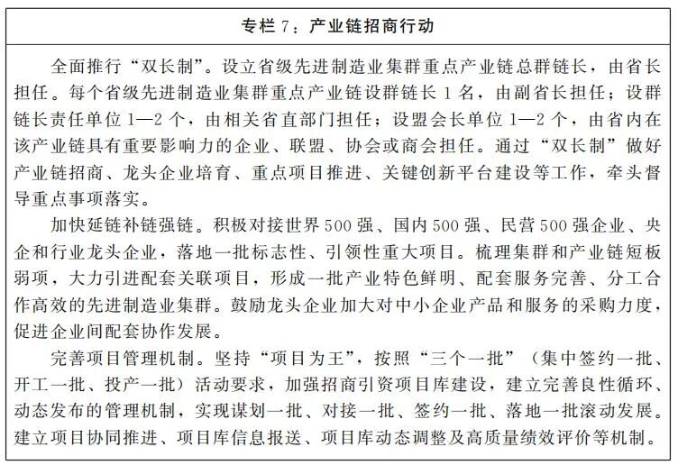 ——产业集群化发展成效显著。通过引进一批龙头项目,打造一批“百千万”亿级优势产业集群,增强招商引资和承接产业转移对全省高质量发展的支撑作用。到2025年,培育装备制造、绿色食品、新型材料、电子信息、节能环保、现代轻纺、绿色建材7个万亿级,汽车制造、生物医药、现代化工3个5000亿级先进制造业集群,打造电力装备、农机装备等30个左右千亿级现代化产业链,先导布局3—5个未来产业链。