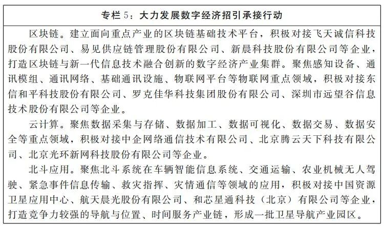 (六)大力发展数字经济。以国家大数据(河南)综合试验区建设为牵引,以核心产业提速、数字转型提质、智慧城市提升为主要途径,以新型基础设施建设为重要支撑,充分发挥海量数据和丰富应用场景优势,大力引进北斗、区块链、软件和信息服务等产业龙头企业和独角兽、单项冠军企业,加快推动数字河南建设。