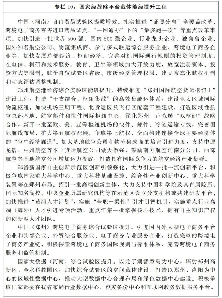 提升中国(河南)自由贸易试验区、郑州航空港经济综合实验区、郑洛新国家自主创新示范区、中国(郑州)跨境电子商务综合试验区、国家大数据(河南)综合试验区等国家级战略平台“五区”能级,强化开发区主载体作用,加快建设口岸和海关特殊监管区,培育乡村振兴产业平台,为招商引资和承接产业转移提供平台载体支撑。