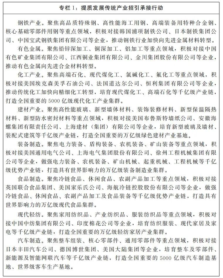 (一)提质发展传统产业。以高端化、智能化、绿色化、服务化为方向,推动传统产业与前沿技术、跨界创新、颠覆模式“高位嫁接”。钢铁、有色、化工、建材等行业,加快引进先进适用技术、新工艺、新设备和新材料,向先进钢铁、先进合金、精细化工和绿色建材等链条延伸,形成精深加工、高端与终端产品制造新优势。装备、食品、轻纺、汽车等行业,围绕产业链关键领域、薄弱环节,积极引进强链扩链型、集群配套型、龙头基地型项目,加快推动传统装备向高端智能装备转型发展,食品加工向绿色食品转型发展,传统轻纺向时尚化、智能化转型发展,传统汽车向新能源及智能网联汽车换道发展。