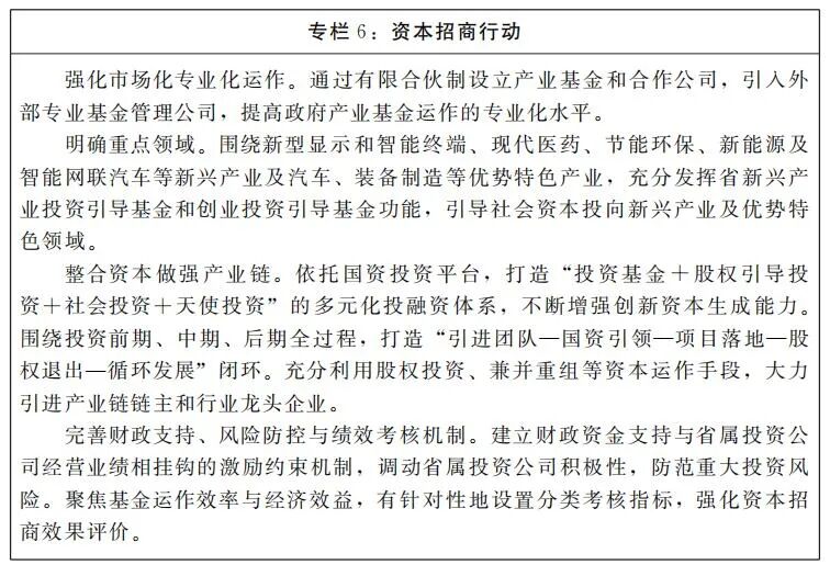 (一)强化资本招商。加快完善基金政策、重塑基金体系、优化基金布局,大力发展天使、风投、创投等基金,打造良好融资环境,深化资本招商。做大做强投融资平台,依托产业发展基金和重点领域子基金,以股权投资等方式参与招商项目,充分发挥政府性资金的引导和杠杆作用,带动更多社会资本投向新兴及优势特色产业领域。发挥好省新兴产业投资引导基金、创业投资引导基金、产业引导基金功能,打造省、市、县三级政府引导基金体系,加快推进实施“基金招商”“金融招商”。