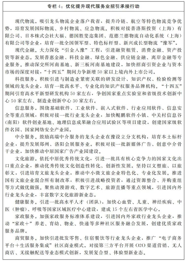 (四)优化提升现代服务业。围绕提升生产性服务业专业化和国际化水平,积极对接国内外知名企业集团、行业协会、国际性组织,大力引进现代物流、现代金融、科技服务、信息服务、中介服务等生产性服务业,推动其向专业化和价值链高端延伸。引进文化旅游、健康养老、家政物业、商贸服务等生活性服务业龙头企业,支持外资进入医疗、康养、文化、旅游、教育、培训等生活性服务业。加快推进郑东新区金融集聚核心功能区建设,引导外资银行、保险、证券、基金等金融机构在豫设立区域性总部或分支机构,大力发展互联网金融、绿色金融、金融租赁等新兴业态,培育天使投资、风险投资市场,支持郑州商品交易所创新发展。抢抓国际物流巨头重新布局的机遇,吸引龙头物流企业落户河南,完善“通道+枢纽+网络”的物流体系,加快发展多式联运,做大做强航空经济、口岸经济、临港经济,打造具有国际影响力的枢纽经济先行区。依托我省丰富的文化旅游资源,围绕创意驱动、美学引领、艺术点亮、科技赋能,大力引进一批产业关联度高、功能融合性强、创新能力突出的文化和旅游骨干企业,推动文旅文创产业高质量发展,打造中华文化传承创新中心、世界文化旅游胜地。引导跨国公司在豫投资企业提升规模和能级,拓展投资、管理、研发、设计、物流等综合功能,通过新设、增资、股权重组等方式,将单一职能的企业升级为地区总部或总部型机构。