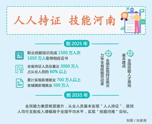 到2035年,全民能力素质明显提升,从业人员基本实现“人人持证”,居民人均可支配收入增幅高于全国平均水平,实现“技能河南”目标。