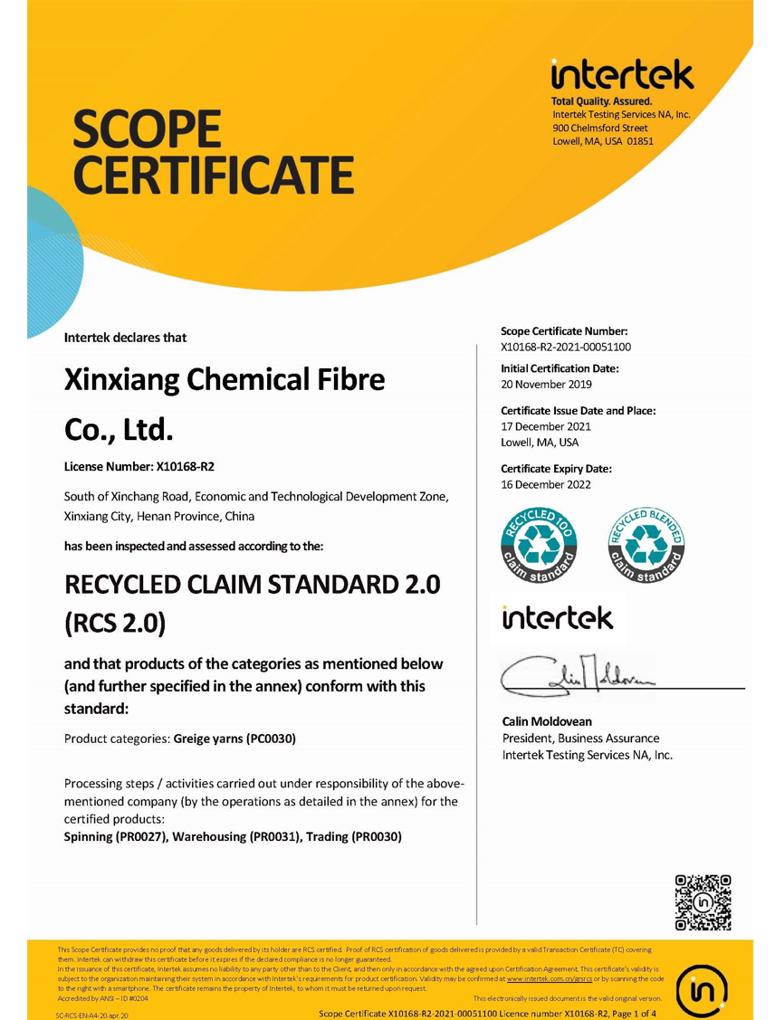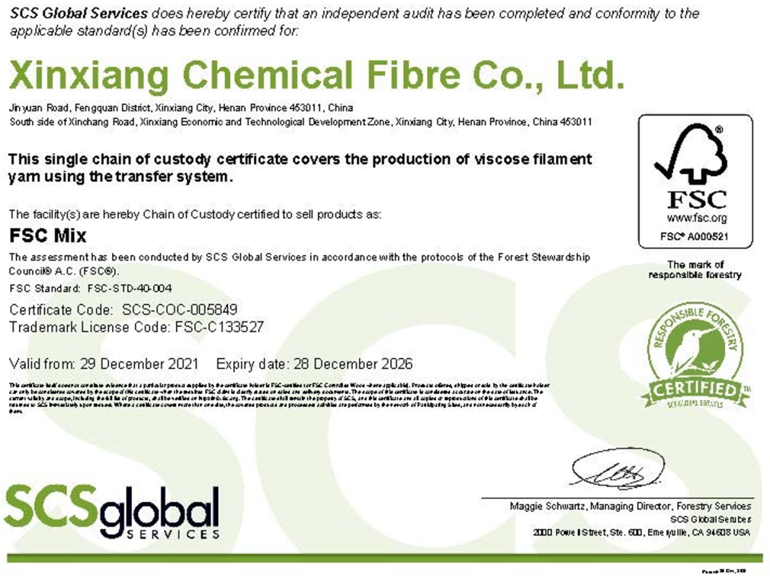 近日,新乡化纤股份有限公司荣获氨纶GRS认证证书,继续保持再生纤维素长丝RCS认证证书。这标志着公司拥有氨纶、再生纤维素长丝两大系列产品再生生产的资质,可以向顾客提供有TC证明的再生产品。同时,公司再次通过FSC林产品产销监管链认证,证书有效期至2026年。