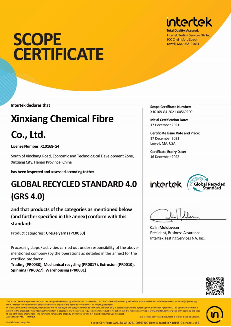 近日,新乡化纤股份有限公司荣获氨纶GRS认证证书,继续保持再生纤维素长丝RCS认...