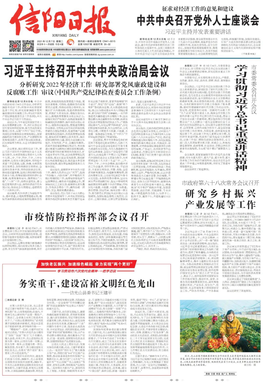 王建平说,站在新发展起点,就要准确把握新发展阶段、贯彻新发展理念、融入新发展格局,坚定不移走好高质量发展之路。具体在光山,就是坚持农业农村优先发展,把解决好“三农”问题作为重中之重,促进农业高质高效、乡村宜居宜业、农民富裕富足。持续实施“多彩田园”提质增效工程,以产业带动群众增收致富。强化粮食生产安全,打造一批省级、国家级知名农业品牌,创建国家级农产品质量安全县。让老区人民过上更好生活,发展实体经济最关键。对此,王建平着重谈三点:一是坚持“项目为王”做大做强主导产业,围绕打造“1+1”百亿级产业集群,推动装备制造和纺织服装产业集群式壮大,着力打造“三元光电”“白鲨针布”“光山羽绒”“光山金刚石”等国家、省知名品牌,持续提高产品附加值。二是培育壮大新兴产业,谋划布局人工智能、大数据、物联网等未来产业,引进腾讯公司建成乡村振兴信创基地,推广“农业+信息化”;盘活官渡河产业集聚区存量资源,大力开展“百园增效”行动,努力创建“一星级”产业园区。三是提档升级现代服务业,以打造豫南区域性商贸物流中心为目标,建成新发地冷链物流园、大锐城智慧电商物流园、现代粮食仓储物流园等项目;做优“电商+光山羽绒”“电商+光山十宝”经营品牌。谈到如何把革命老区建设得更好,王建平说,光山县积极探索以建设先行区带动全县乡村振兴全面发展的新路子,于今年9月启动了乡村振兴先行区建设。成立了红色文化宣教中心,先行区包括司马光油茶园和文殊乡东岳村、南王岗村、花山寨村以及龙山湖共61平方公里区域。同时,每位县处级干部都要牵头在所联系的乡镇每年打造一个乡村振兴示范村,逐步带动全县乡村振兴全面发展。不断提升农村人居环境整治水平,创建更多美丽小镇、四美乡村、五美庭院。充分利用城市拆迁腾退地、边角地,建设“口袋公园”、体育公园,新建一批城市书房,建成“四馆一中心”,打造“15分钟休闲生活圈”;持续推进官渡河区域综合治理,真正把官渡河沿岸区域建设成为宜居宜业之地。谈起红色,王建平兴致更高。他说,光山有红色革命旧址、遗址、纪念地325处,为了让红色精神转化为奋进力量,已经修复斛山寨战斗遗址,改造提升邓颖超祖居、王大湾会议会址纪念馆、五虎岔羊革命战斗纪念馆;组建红色宣讲团,开展学党史主题宣讲。同时,搜集、挖掘光山“红色故事”,推动红色文化进社区、进校园;加快建设红二十五军长征国家文化公园,完成王大湾红色文化体验区、鄂豫皖苏区烈士陵园等革命遗址提升工程;充分发挥邓颖超祖居教育基地的作用,大力开展红色文化宣讲活动,努力建设红色光山。王建平表示:“2019年9月17日,习近平总书记视察河南深入信阳到光山考察调研,为光山发展擘画了美好蓝图。光山人民一定会牢记领袖嘱托,务实重干,奋勇争先,创造更加幸福美好的明天。”