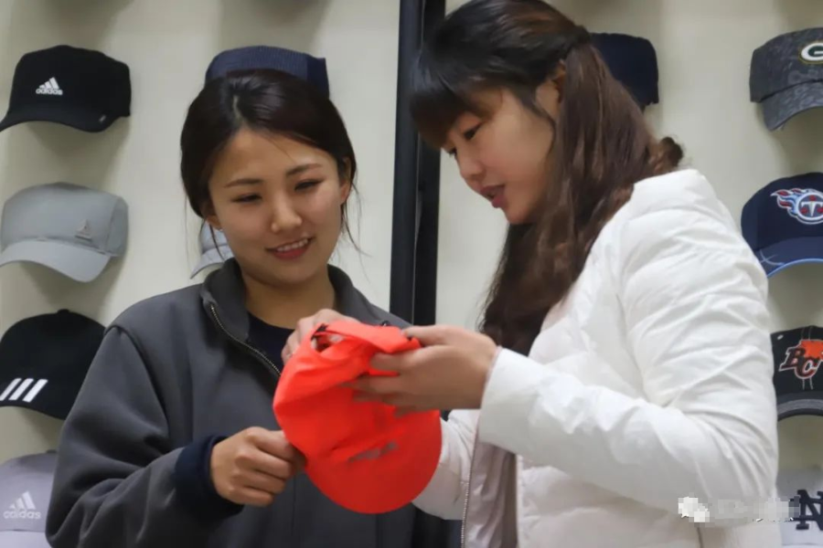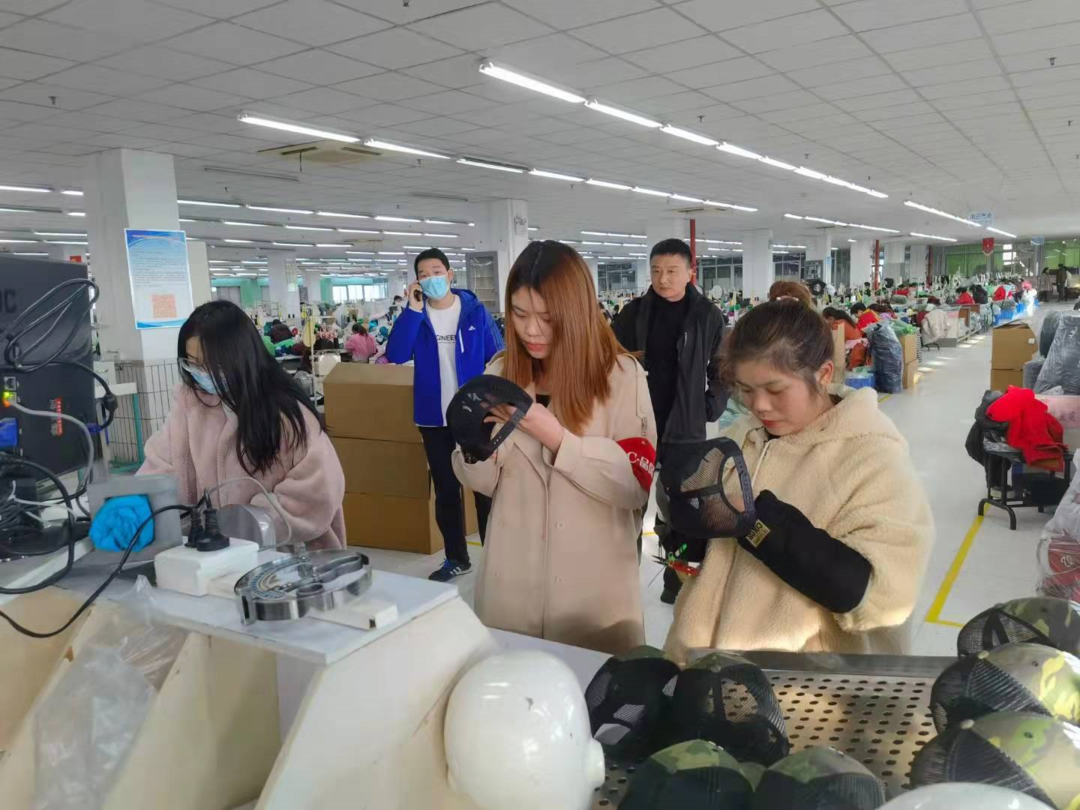 宽敞明亮的车间内,电脑智慧操作,机声咔咔作响,身着工装的女工往来穿梭忙碌;一顶顶工艺精细、造型美观的运动帽和休闲帽摞放整齐,等待检验检测……