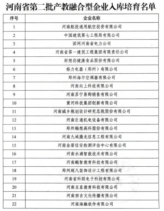 这些企业涉及哪些领域?有啥特征?根据《河南省发展和改革委员会、河南省教育厅关于组织我省第二批产教融合型企业建设培育单位申报工作的通知》,重点建设培育主动推进制造业转型的优质企业,现代农业、高端装备、绿色食品、生物医药、节能环保、人工智能、5G、新材料及研发设计、现代物流、检验检测认证、电子商务、服务外包等急需产业领域企业,以及家政、健康、旅游、中医诊疗等社会领域龙头企业。