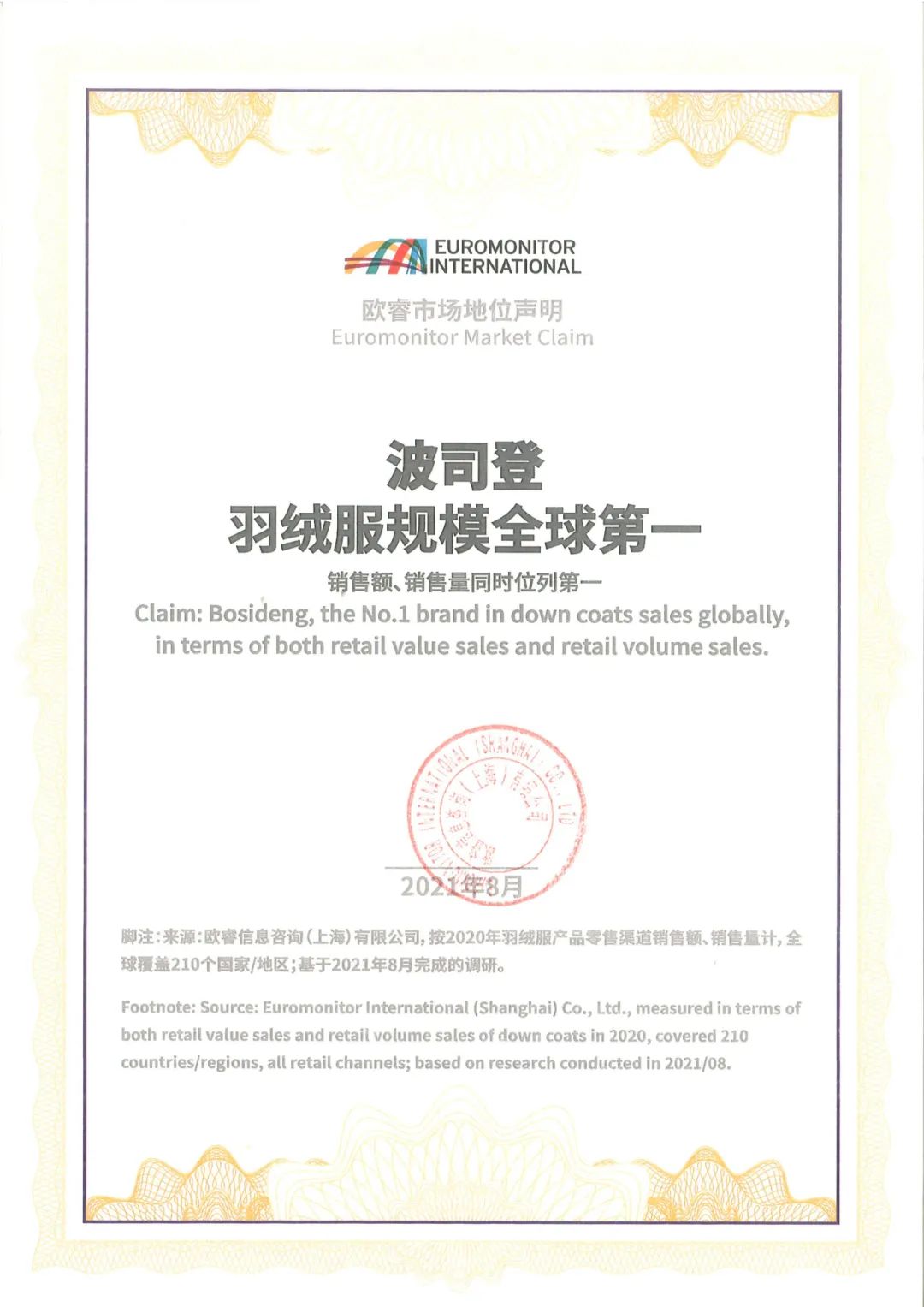 今年,波司登在羽绒服规模上实现了全球领先,成功获得了由世界知名市场调研机构欧睿国际颁发的“羽绒服规模全球第一”证明,正式迈入全球羽绒服行业第一梯队。