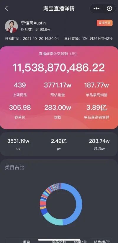 10 月 20 日是这个双十一开始的第一天,淘宝那天还是崩了。李佳琦和薇娅的直播间是这场崩溃的始作俑者。李佳琦预售定金计算尾款数据,销售额达到了 115.39 亿元。
