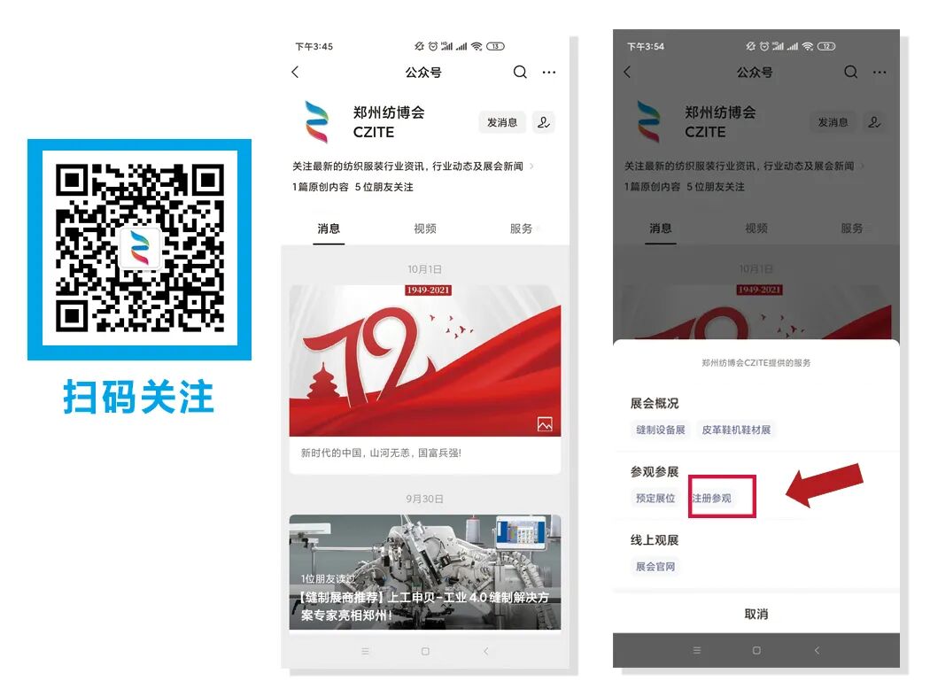 扫描下方二维码,关注「郑州纺博会CZITE」公众号,回复【电子会刊】,实时获取参观指南。